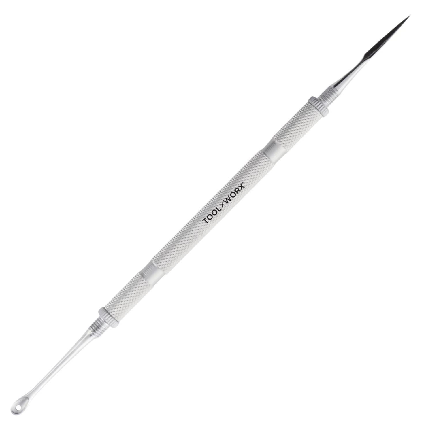 Stainless steel tool with lancet and extractor. Ends unscrew and store in handle. Removes both blackheads and whiteheads. Specifically designed for safely and efficiently cleaning out the pores with minimum pressure to avoid harming the skin. Best to use after showering or opening pores with warm washcloth.